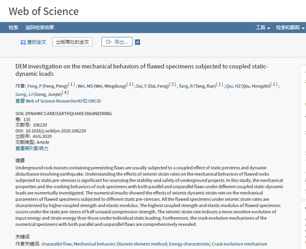 第一单位在工程领域国际期刊《Soil Dynamics and Earthquake Engineering》(中科院二区,IF=2.637)上发表了题为“DEM Investigation on the Mechanical Behaviors of Flawed Specimens Subjected to Coupled Static-dynamic Loads”的最新研究成果。