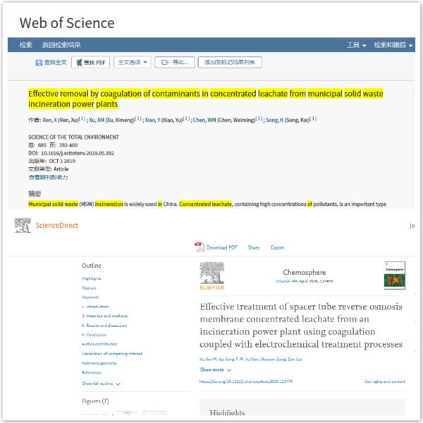 博士期间,任旭以第一作者在SCI期刊发表学术论文4篇,研究成果Effective removal by coagulation of contaminants in concentrated leachate from municipal solid waste incineration power plants、Effective treatment of spacer tube reverse osmosis membrane concentrated leachate from an incineration power plant using coagulation coupled with electrochemical treatment processes于2019年分别发表于TOP学术期刊《Science of the total environment》(中科院一区,影响因子6.551)和《Chemosphere》(中科院二区,影响因子5.778)。