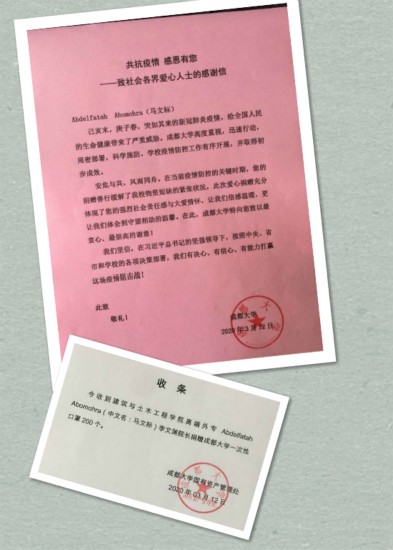 在当前新冠肺炎疫情防控的关键时期,学院高端外专Abdelfatah Abomohra(马文标)、院长李文渊了解到学校防疫物资短缺的紧张情况,多方筹措到200只一次性医用口罩,于3月12日无私地捐赠给成人视频 。此次爱心捐赠充分体现了两位老师强烈的社会责任感和大爱情怀,也展现了建工人的社会担当和守望互助之心。