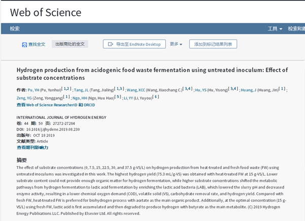 第一单位在工程技术领域著名期刊《International Journal of Hydrogen Energy》(中科院二区期刊,影响因子4.084)上发表了一篇题为“Hydrogen production from acidogenic food waste fermentation using untreated inoculum: Effect of substrate concentrations”的最新研究成果。