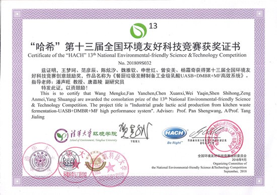环境工程专业学生王梦珂、范彦辰、陈炫汐、曾安美、魏雅钦、申世红、杨霜奇等同学完成的作品《餐厨垃圾发酵制备工业级乳酸USAB+DMBR+MF高效系统》经“第十三届全国环境友好科技竞赛”组委会网上初选、专家评选、片区初赛、分组决赛等环节的层层筛选,最终从1200余份参赛作品中脱颖而出并获得创意鼓励奖。