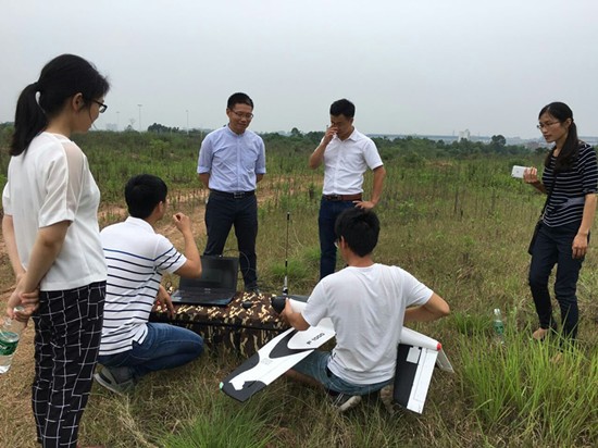 属于禁飞区,下午15:00,一行人驱车前往选取的实验区域——成都南延线附近,飞马公司代表进行了无人机试飞,获取了高分辨率无人机影像及POS数据,让我们充分了解了从前期的航迹规划到无人机起飞、降落的作业流程。