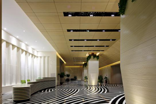本次设计还大量使用新型材——通体微晶石来完成,在建筑的外立面、室内地面、室内墙面以及局部顶面均采用微晶石来完成。本项目创新性地使用多项国内未出现的超规范新工艺——超大体量板材、双曲面弧线微晶石工艺技术、叠加微晶石异形柱、微晶石彩雕大板外墙挂板等工艺技术。大胆的设想在施工图前期经过专家论证会后最终得以呈现。