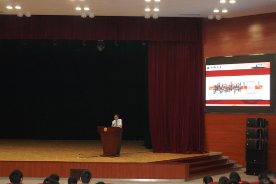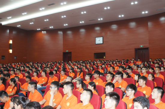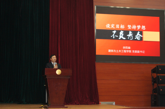党委副书记余阳燊老师为学生们发表了以“设定目标,坚持梦想,不负青春”为主题的演讲。余书记引用了体育界的一句名言“走下领奖台,一切从零开始”,新生们领到成大的录取通知书,一切也从零开始,成绩只能说明过去,不能代表将来,来到成大,要设立一个目标,坚持梦想,才能不负青春。余书记问了同学们一个问题:什么是理想?理想这个词,我们从小听到大,作为祖国未来的青年一代,我们有理想,有担当,国家就有前途,民族就有希望,实现中华民族伟大复兴就有源源不断的强大力量。我们学院的发展,也紧跟随国家一带一路的战略方针,一带一路建设的优先领域是基础设施的互联互通,这和我们学院的专业紧密相关,和各位同学密切相关,同学们要把自己的发展和国家的发展连在一起,把自己的命运和国家的命运连在一起。