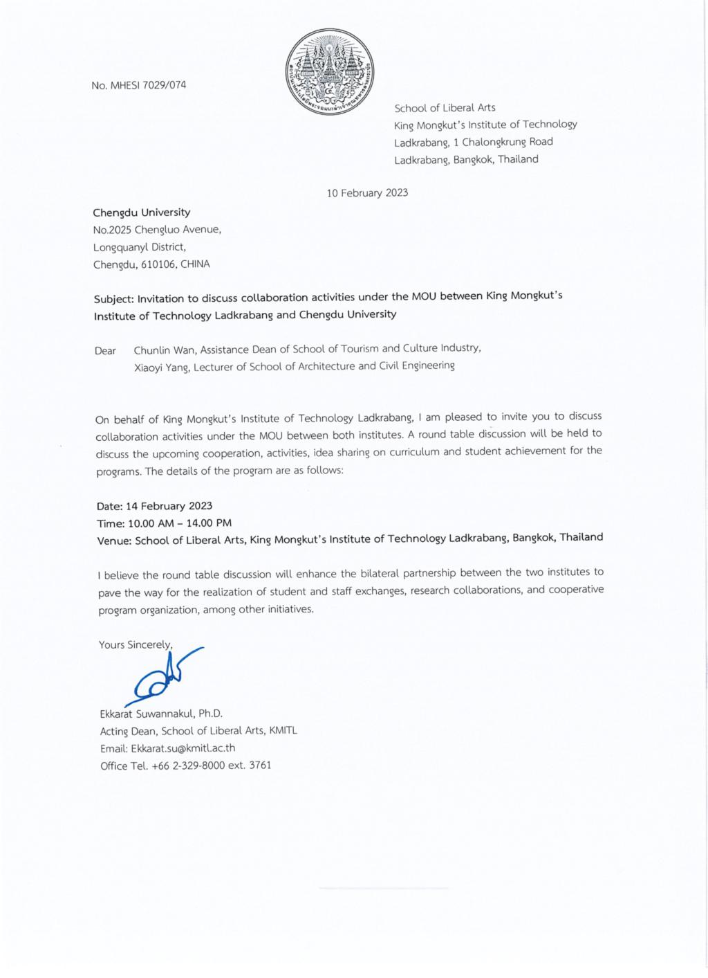 建筑学系杨晓艺老师于2023年2月10日,受邀前往泰国先皇理工大学(King Mongkut's Institute of Technology Ladkrabang 简称:KMITL)展开学术交流。期间,杨晓艺老师向KMITL院长Ekkarat Suwannakul, Ph.D.及院长助理及相关教授介绍了建筑与土木成人视频概况