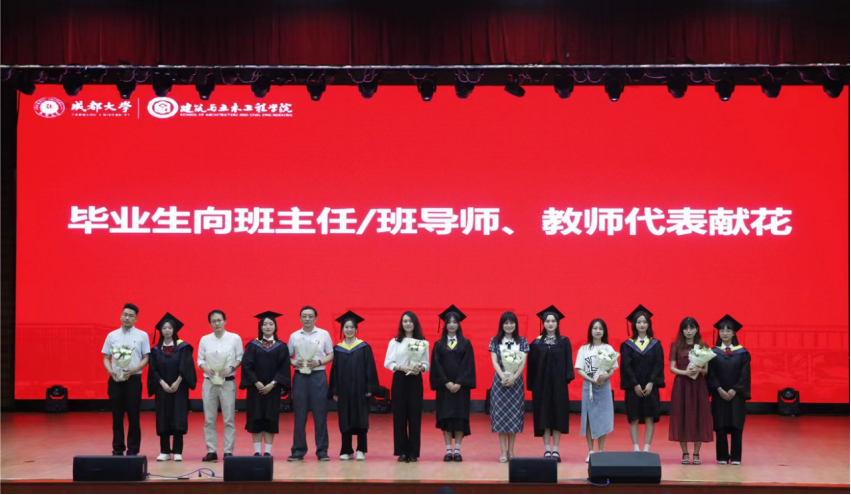 紧接着,毕业生代表为班主任、班导师及教师代表敬献鲜花,感谢他们四年来的悉心教导与关怀。