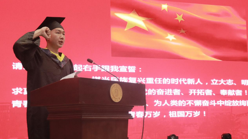 典礼第九项议程,由土木工程专业严承丞同学带领毕业生进行宣誓。