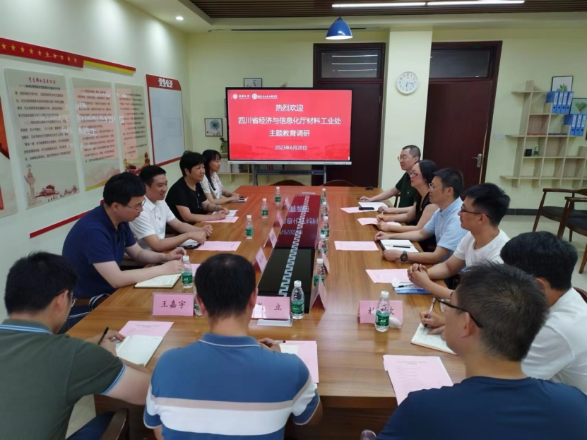 6月20日下午,四川省经济和信息化厅材料工业处贾小蓉二级巡视员、卿家胜副处长、王羽副处长、韩志东一级主任科员赴学院开展主题教育调研座谈会,学院院长陈小平、副院长王静以及教师代表参加座谈会。