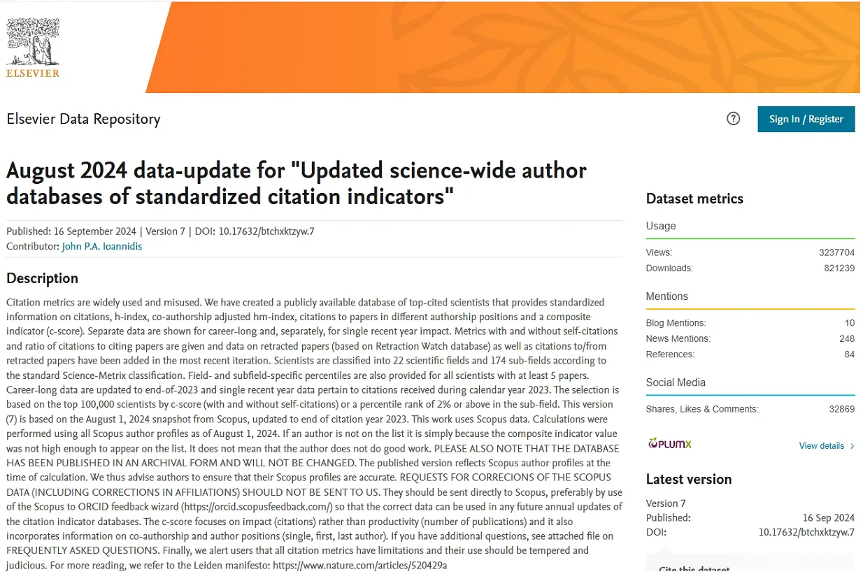 该榜单由美国斯坦福大学与Elsevier旗下Mendeley Data发布,基于Scopus数据库使用六种关键因素的指标进行打分并排序,重点关注学者论文成果的质量、数量及被引用情况。榜单从全球近700万科技工作者中,筛选出世界前2%的顶尖科学家,旨在提供一个评价科学家长期科研表现的衡量指标,以更客观、更真实地反映科学家的影响力。入选该榜单,表明该学者在其研究领域具有较高的世界影响力,并作出重要贡献。