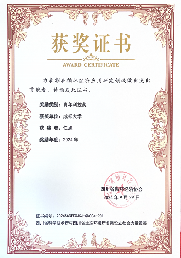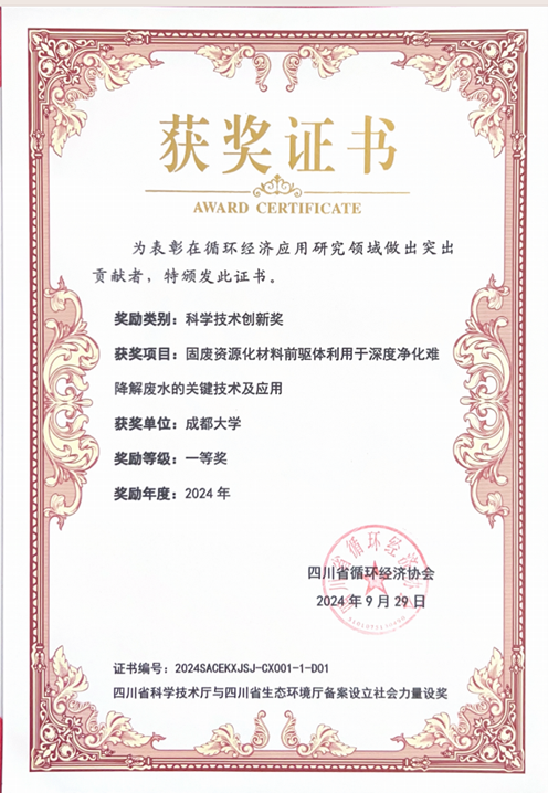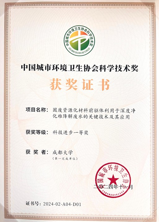 其中,由任旭、曾丽、马强、彭鑫博士等主要参与的《固废资源化材料前驱体利用于深度净化难降解废水的关键技术及其应用》项目,分别获得中国城市环境卫生协会科学技术奖一等奖、四川省循环经济协会科学技术创新奖一等奖。该项目开发了利用典型大宗固废制备复合功能环境响应型材料处理难降解废水的一系列技术,在突破难降解废水的低成本处理技术瓶颈的同时,提出了大宗固废低碳利用新途径。开发的“固废资源化材料前驱体的定制化设计、制备与低碳利用”和“复合功能环境响应型材料应用于难降解废水深度净化”技术已在多家环保科技公司的项目中推广应用,近三年来带来经济效益超3亿元,产生了重大的社会、环保与经济效益。