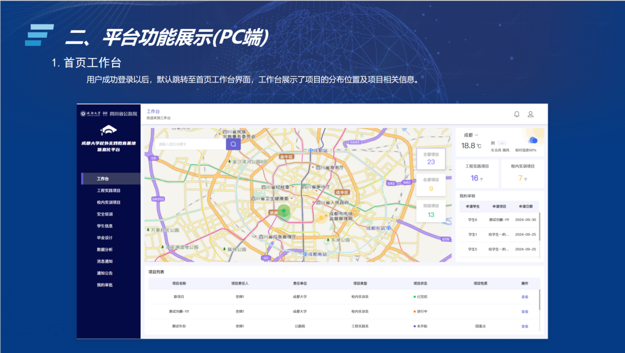 演示专家详细展示了各功能模块的操作方法。PC端功能丰富,涵盖教学管理各环节,从项目管理到学生信息,从数据分析到审批流程,彰显了平台在实践教学管理中的高效与便捷。移动端APP和小程序依据不同用户角色设置权限,教师与学生可通过手机端实现教学互动的无缝对接,充分体现了教学管理的移动智能化趋势。