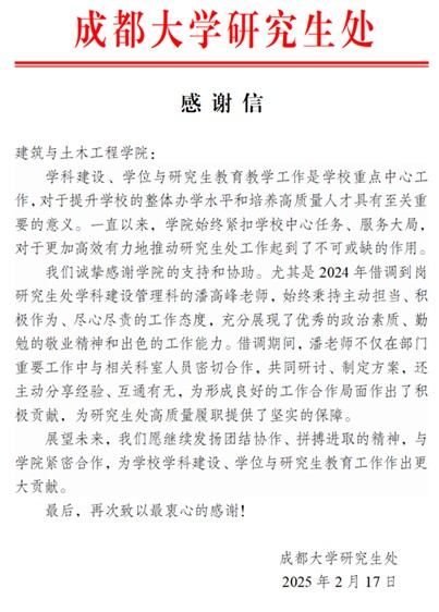 潘高峰博士挂职期间,积极参与我校博士学位授权点申报、研究生招生考试、双一流学科建设以及博士学位点培育等多项重要工作,始终秉持主动担当、积极作为、尽心尽责的工作态度,充分展现了优秀的政治素质、勤勉的敬业精神和出色的工作能力,获得了所在研究生处领导及同事的高度认可和一致好评。