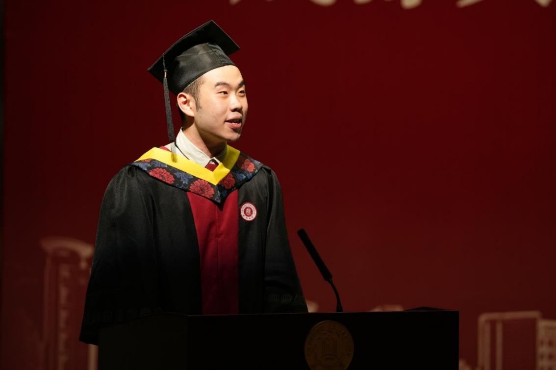 在毕业生代表李凯文同学的发言中,他满怀深情地回顾了四年学习与生活的点滴,表达了对老师、同学和母校的感恩,并满怀憧憬地分享了自己对未来的坚定信念和美好期许,让大家看到了年轻一代的朝气与担当。