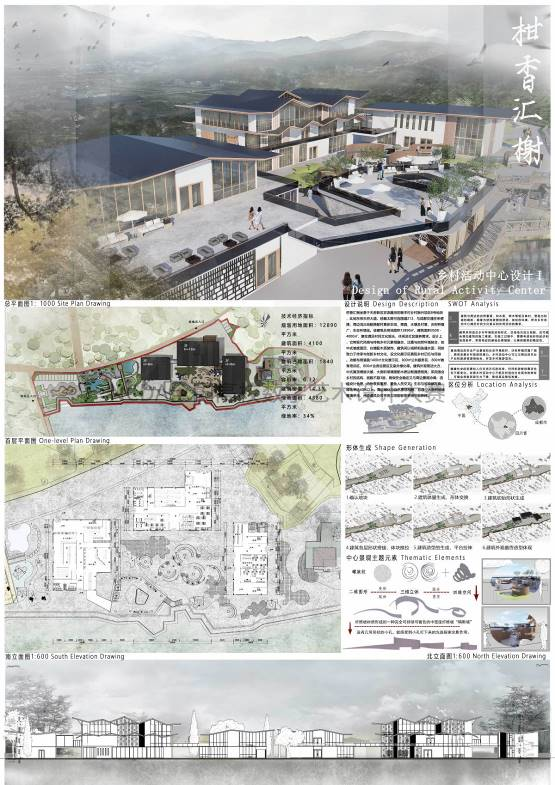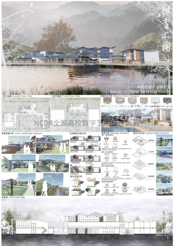 此外,作品《柑香汇榭一乡村活动中心》荣获全国二等奖(作者:周佳钰、刘玉芳,指导教师:张妍、李际梅)。该作品位于天府新区粮丰村,总建筑面积约3500–4000㎡,设计融合现代风格与传统乡村元素,包含文化展示、公共服务、教育培训等功能区,致力于满足村民文化娱乐与社区服务需要,并通过绿色设计手法实现与自然环境的有机融合。