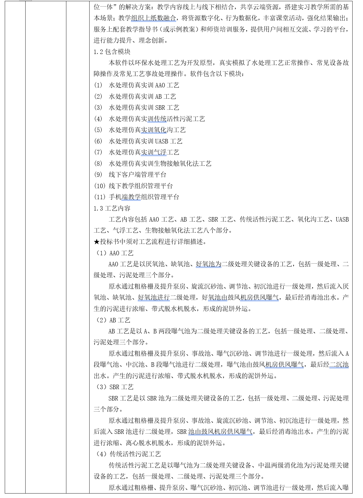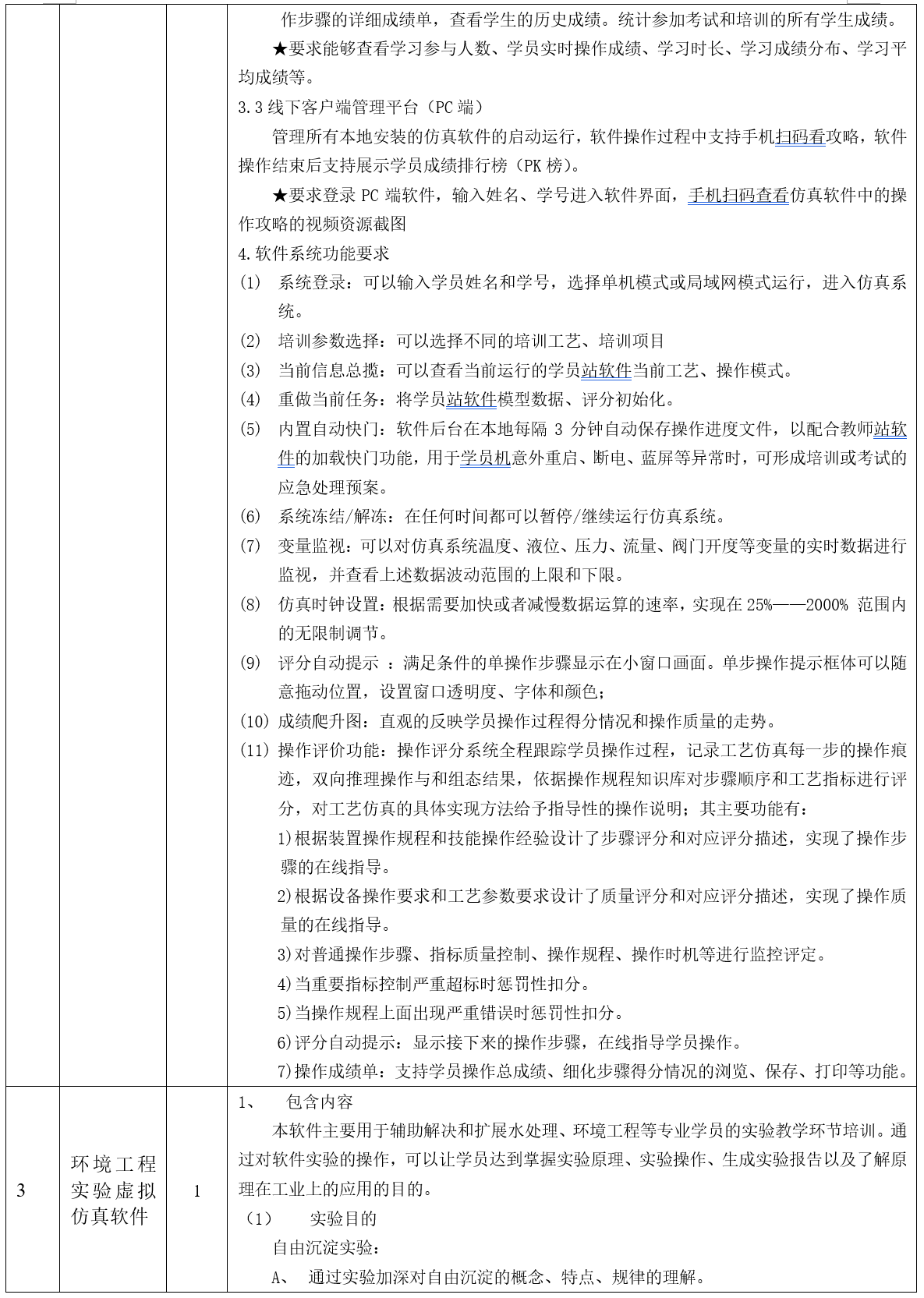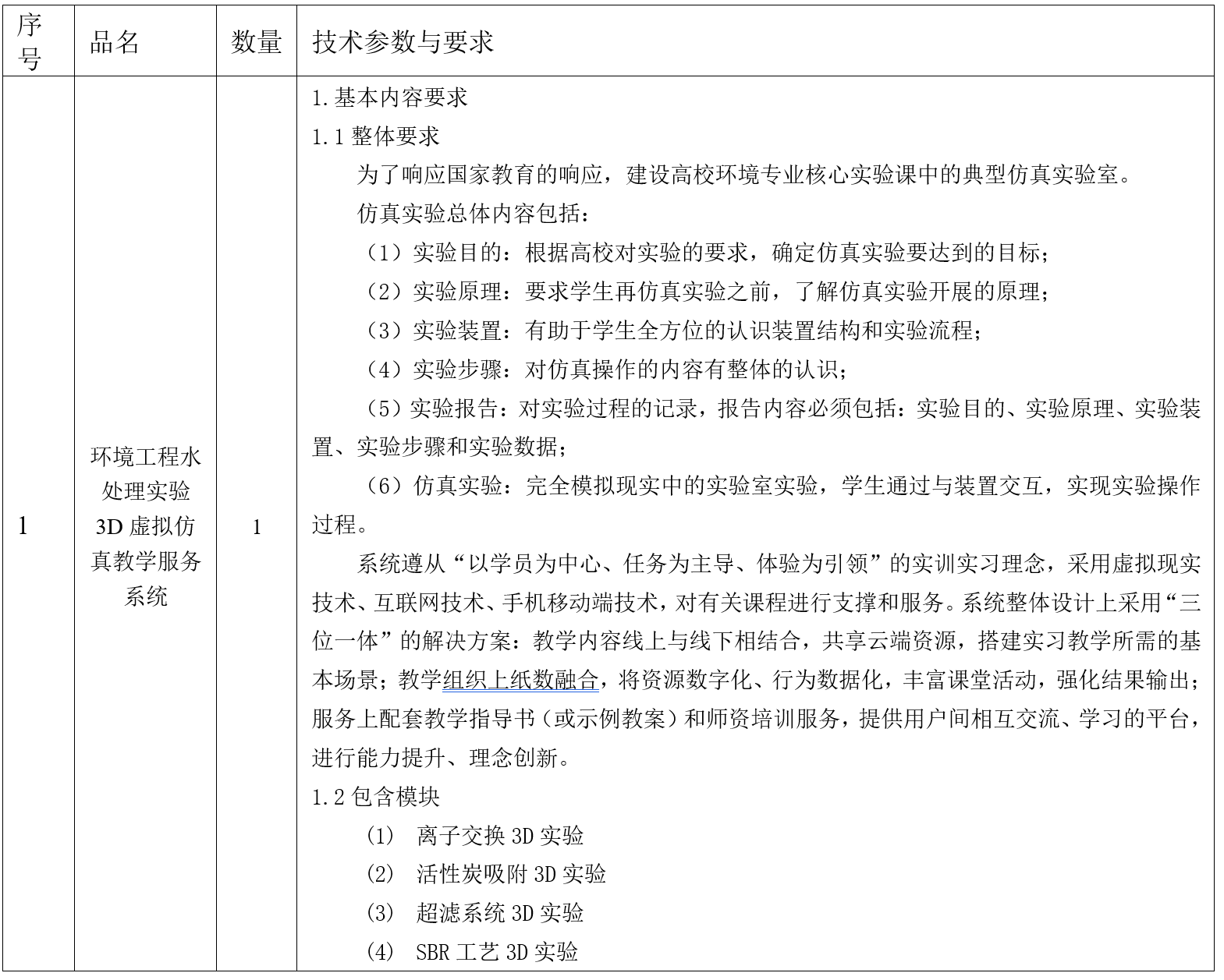 本项目包括环境工程水处理实验3D虚拟仿真教学服务系统、城市污水处理工艺虚拟仿真教学服务系统专业教学软件、环境工程实验虚拟仿真软件购买,要求满足不少于100台电脑同时使用。