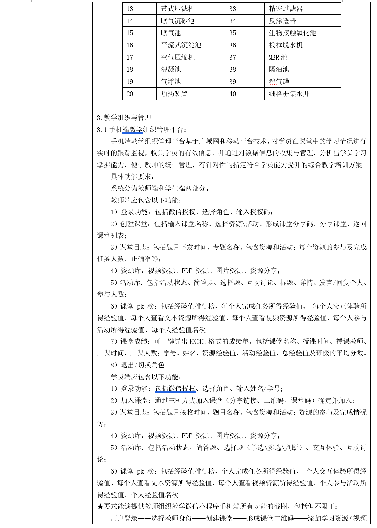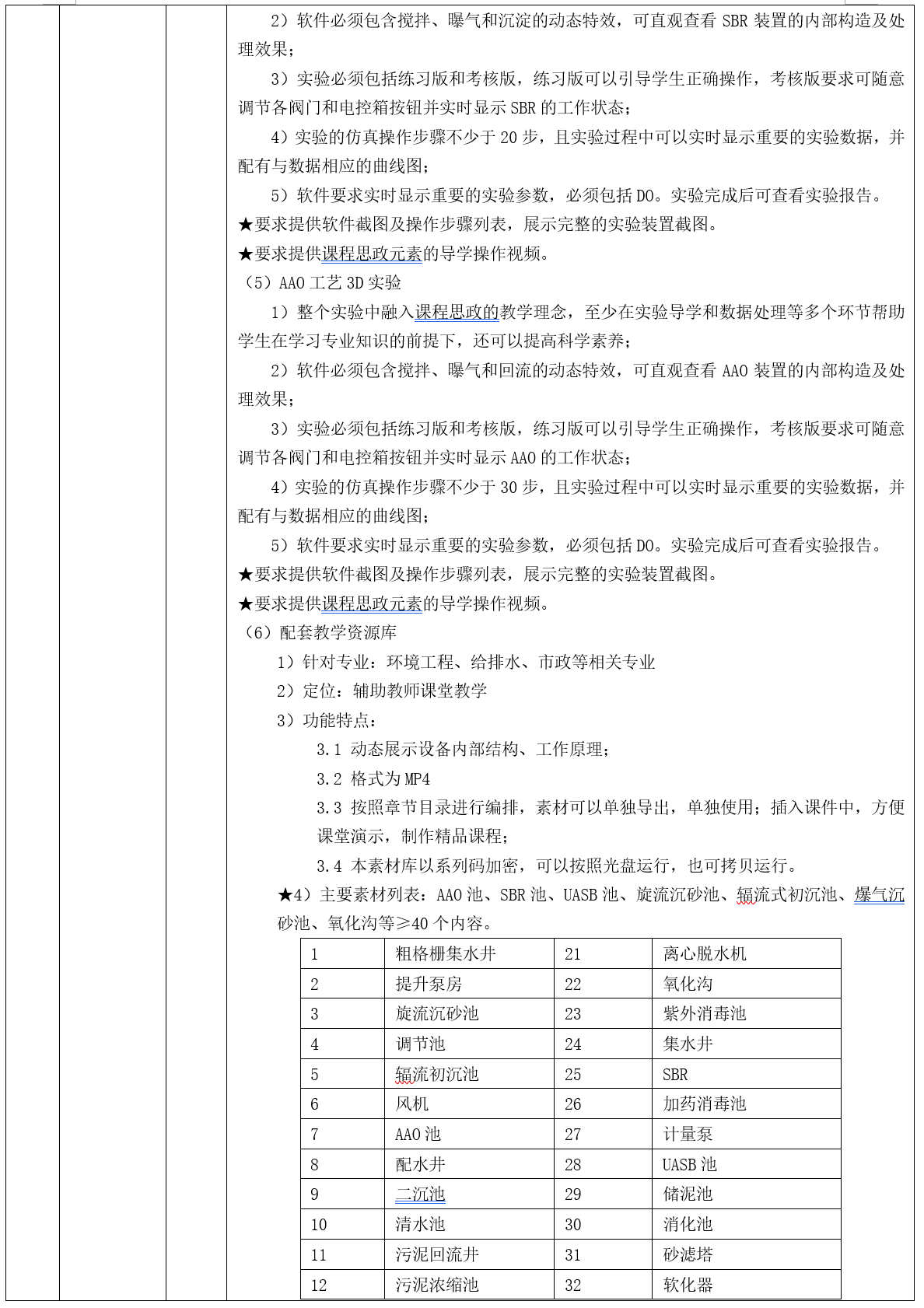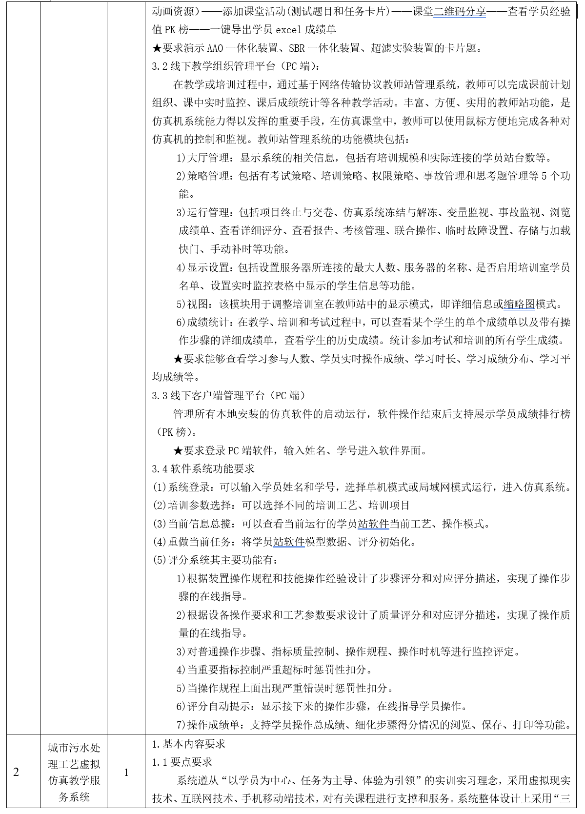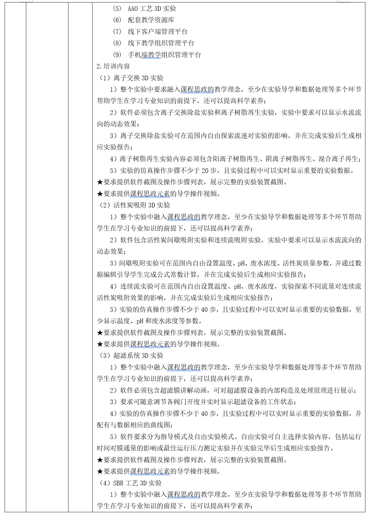 本项目包括环境工程水处理实验3D虚拟仿真教学服务系统、城市污水处理工艺虚拟仿真教学服务系统专业教学软件、环境工程实验虚拟仿真软件购买,要求满足不少于100台电脑同时使用。