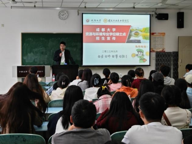 董建辉一行首先前往乐山师范学院旅游与地理科学科学学院和新能源材料与化学学院。曾丽和姚远向乐山师范学院相关专业同学介绍了资源与环境专业学位硕士授权点环境工程和测绘工程领域的特色优势、师资队伍、考试科目、学位授予要求等情况,董建辉对考研各环节、奖学金政策、学生就业等情况进行了答疑。