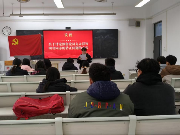 活动伊始,李斗同志宣布了会议流程和主题,根据党支部发展党员工作计划,得到上级党委的预审同意,讨论接收潘虹羽、代坤航、张思诺、李圳冬、刘东森、马海马强、陈柏烨、阿尔小虎等8名同志为中共预备党员以及讨论预备党员亢永祥、刘可、濮欣然、张尧等4名同志的转正问题。