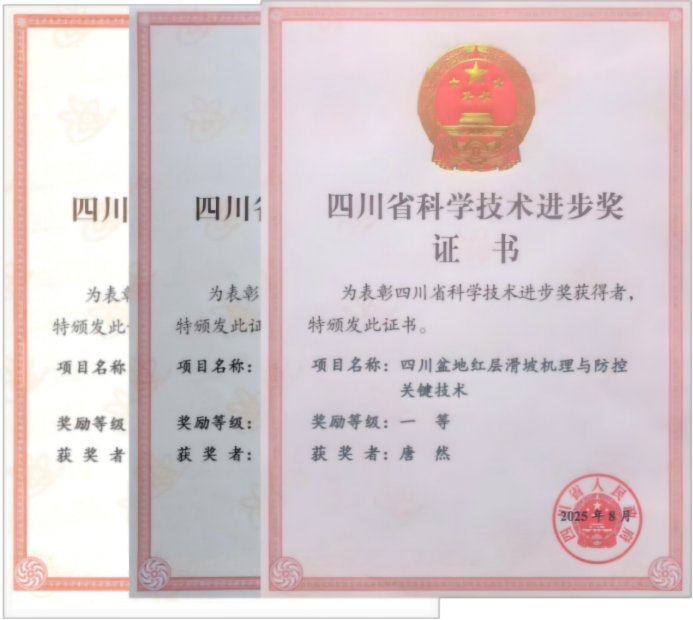 此外,学院还深度参与完成的两项成果亦获奖:《四川盆地红层滑坡机理与防控关键技术》荣获科技进步一等奖,学院排名第5单位。项目聚焦四川地区典型地质灾害的致灾机制与工程防控技术,为区域地质安全提供了理论支撑与工程保障;《大跨径单主缆悬索桥结构体系创新及建造关键技术》荣获科技进步三等奖,学院排名第3单位。项目攻克了大型桥梁在结构设计与施工过程中的一系列难点问题,对提升我国桥梁建造技术具有重要意义。